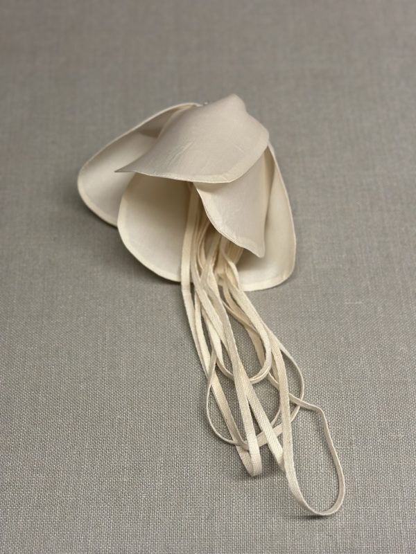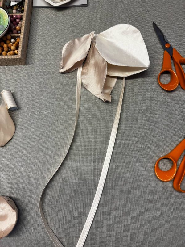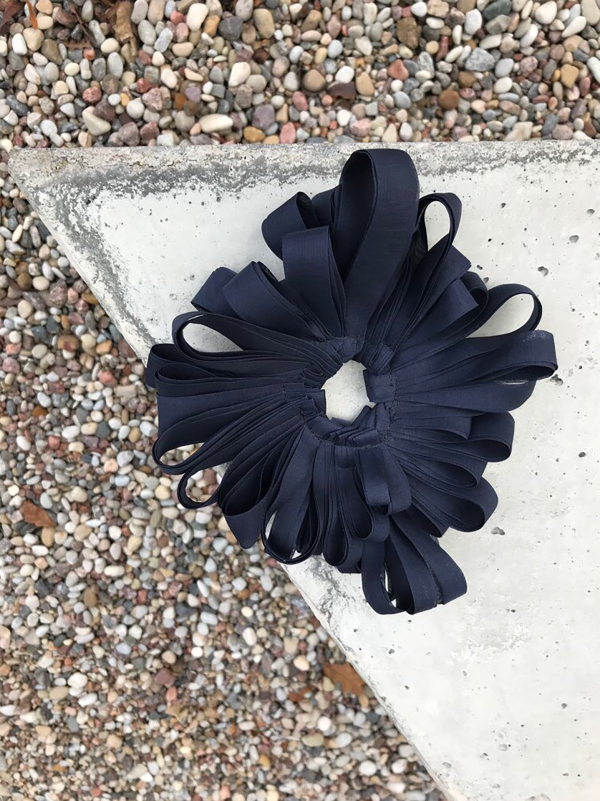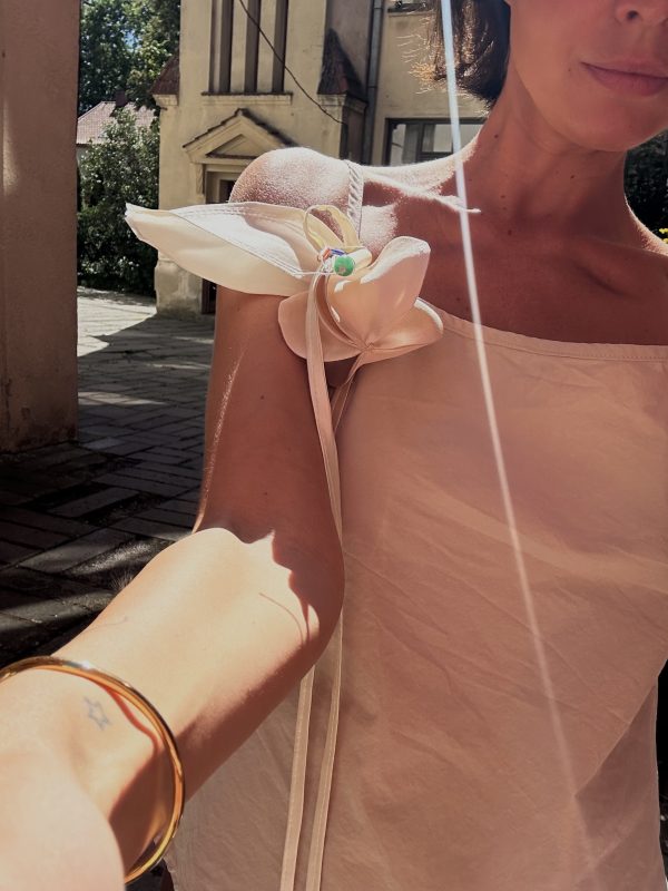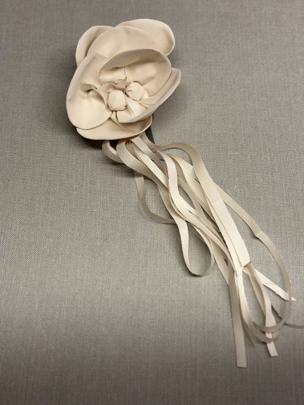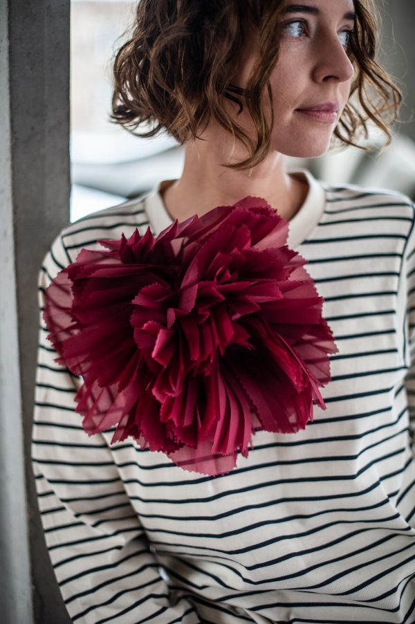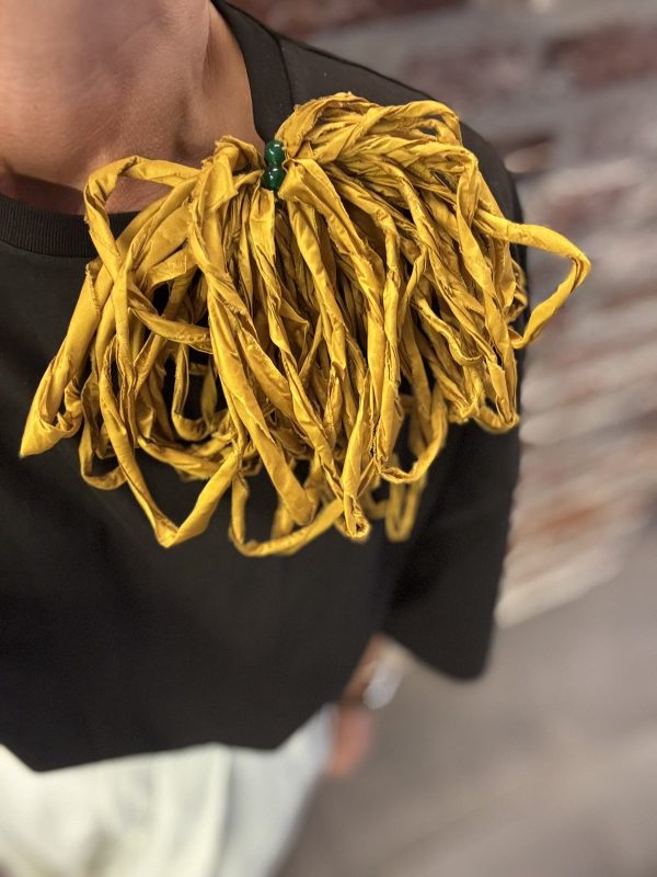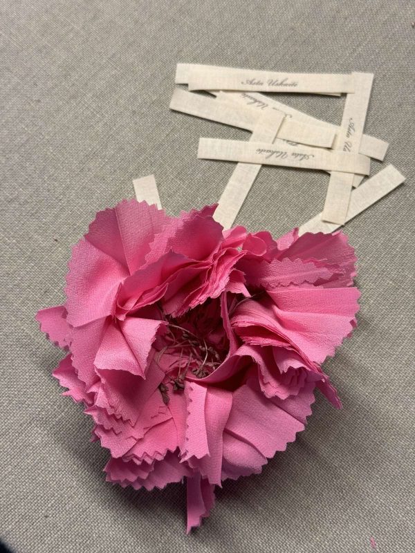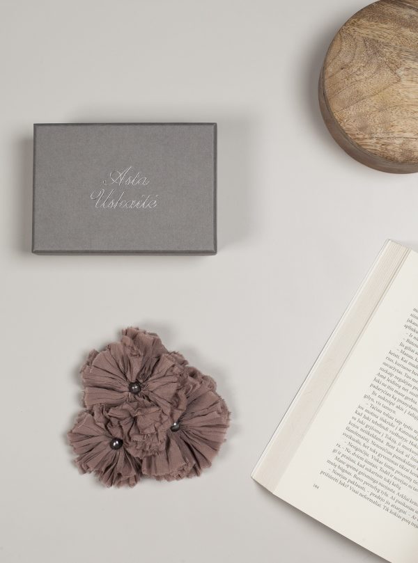 Tai rankų darbo sagė, pagaminta iš natūralaus šilko.
