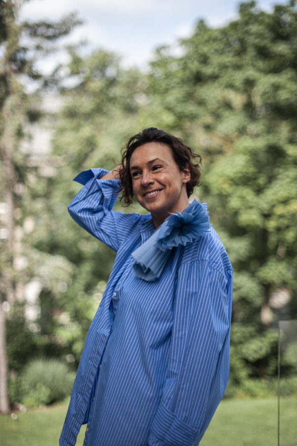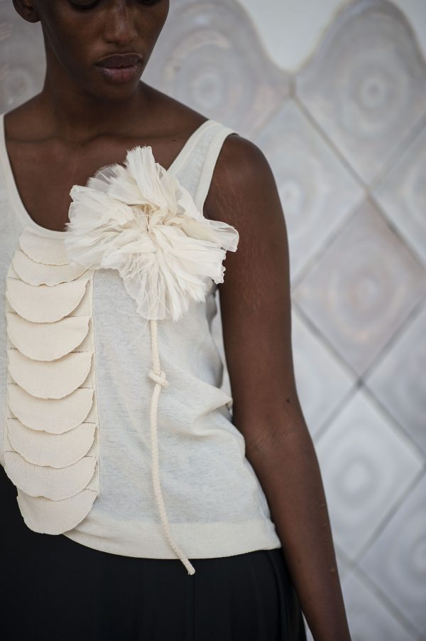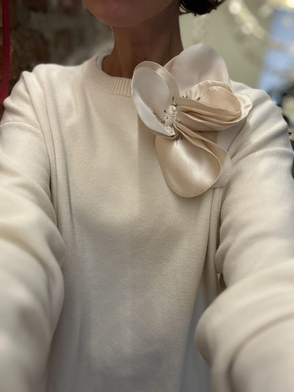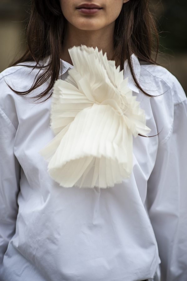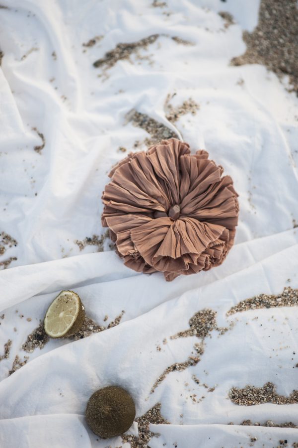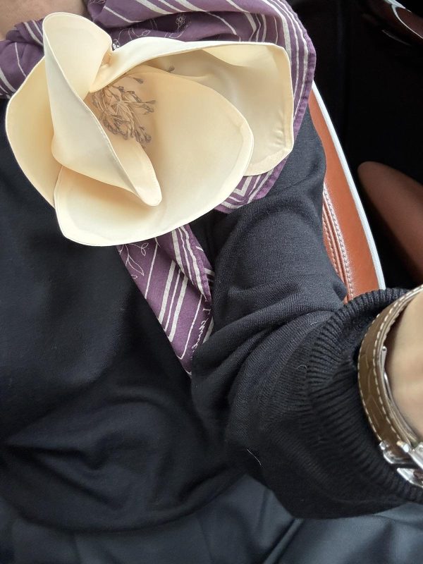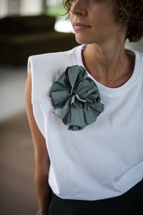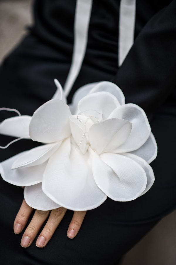 Tai rankų darbo sagė, pagaminta iš natūralaus šilko.
