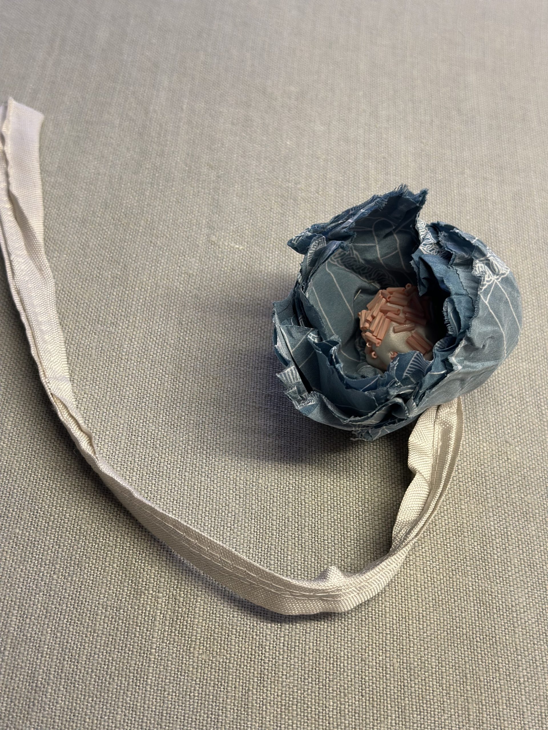 Tai rankų darbo sagė, pagaminta iš natūralaus šilko.